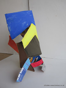 But where to start? Well, with an Abstract Head FORM. And some cardboard. First to create a 2D plane with all the parts. [7] Then to create a single form, using masking tape. [8] Then to morph the form into a cylinder.[9] Of course it´s not a complete cylinder, as the cardboard won´t bend perfectly. And then to FRACTURE it by cutting some adjoining planes, allowing the cardboard to try to reform a flat surface.[10,11,12] This works pretty well, and I could imagine it created as a 10m high Cor-Ten steel sculpture in a roundabout, especially one approached from the top of a hill. But now I want to define the planes again, so I paint them all a different colour.[13,14] Perhaps it´s just my colour choice, but this is looking terrible. Also, one of the sculptures loses integrity and collapses with the wet paint. I think spray paint would be better. A single colour. That seems to be working better.[15,16]